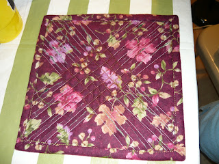 Then carefully cut up the center of each channel. You will be cutting through the top 3 layers only! Stop about 1/4" from the stitching lines that crisscross in the center of the hot pad.All that is left to do is to trim the sides and square up the pad. Attach the binding using a 1/2" seam allowance. The binding can be sewn down on the back side by hand or by machine.